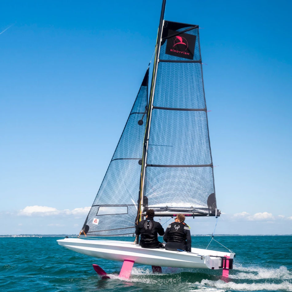 Le Birdyfish est un dériveur de nouvelle génération. Équipé de foils en »J » autorégulés et d’un plan porteur sur le safran, il ne faut que quelques noeuds de vents pour faire décoller le Birdyfish et atteindre des vitesses élevées jusqu’alors réservées aux régatiers de haut niveau. Avec son concept de carène Scow et ses foils latéraux, le Birdyfish est un concentré de technologies issues de la course, avec pour objectif l’accessibilité aux vols et aux performances.