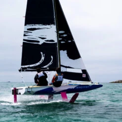 La large étrave inspiré des Scow (voilier rapide), procure une sensation de glisse unique et une grande manoeuvrabilité. Sur le pont cette largeur se traduit par plus d’espace de rangement.