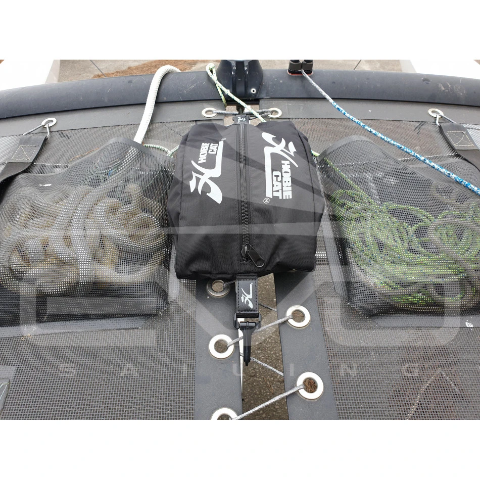 la pochette de trampolin Hobie Cat est un accessoire très pratique pour y ranger du petit accastillage de secours, une VHF étanche, une gourde et une petite collation.