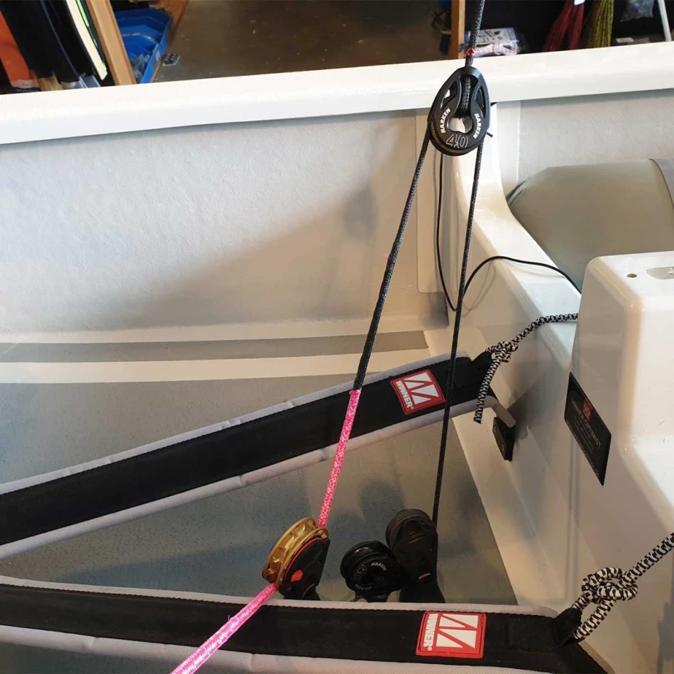 Lorsque les jeunes rĂ©gatier.es seront plus Ă l’aise en 3 brins, il suffira juste d’enlever la poulie basse du kit qui est attachĂ© Ă la poulie haute avec une manille textile.