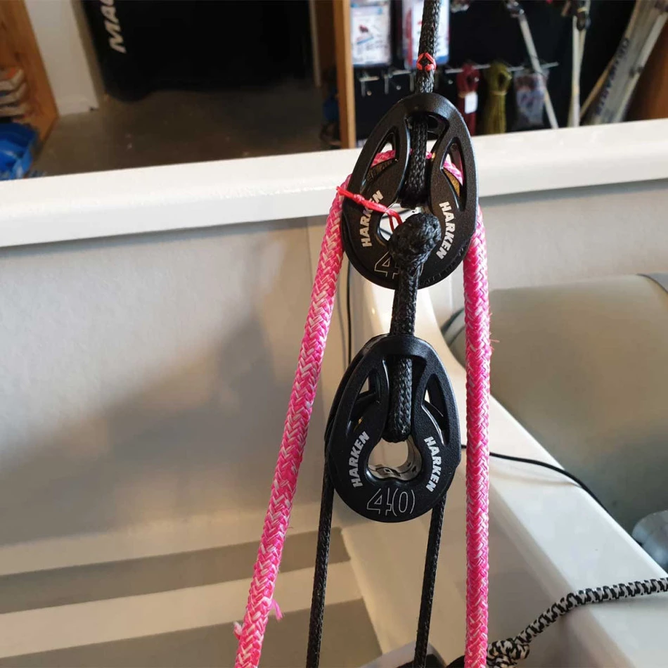Notre kit de poulies est rĂ©alisĂ© de telle maniĂšre qu’il est possible de le passer en 3 brins, mĂȘme sur l’eau. Il suffit pour cela de larguer le point fixe de l’Ă©coute qui se trouve au fond du bateau.Â